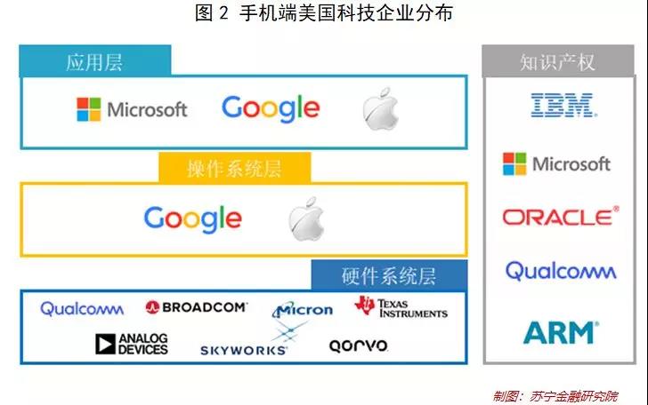 手機端技術(shù)可粗略歸納為3個不同層次,它們是應(yīng)用層、操作系統(tǒng)層和硬件系統(tǒng)層,其中,應(yīng)用層和操作系統(tǒng)層是軟件。貫穿這3層的還有知識產(chǎn)權(quán)類產(chǎn)品,它以專利授權(quán)的形式體現(xiàn),很多情況下都不涉及具體軟件和硬件實體。下面,我們具體來看一下手機端有哪些有實力的美國科技公司,以及他們所在的技術(shù)層。