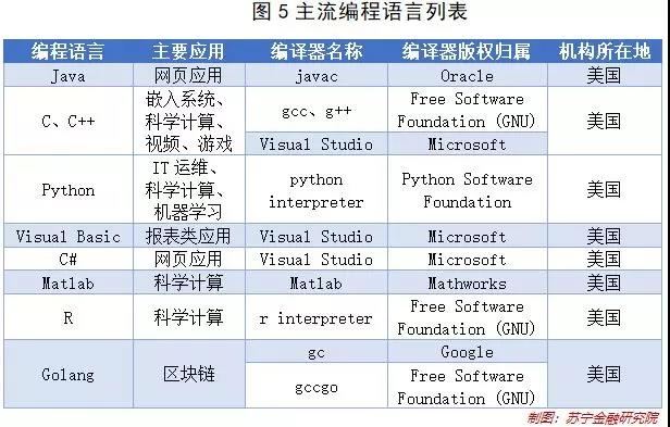 在這些編程語言當(dāng)中,有很多已成為國際標(biāo)準(zhǔn)。需要指出的是,雖然語言本身已成為國際標(biāo)準(zhǔn),但其具體實現(xiàn)(專業(yè)術(shù)語叫編譯器)還是有版權(quán)的。以下表格匯總了上述編程語言的主要應(yīng)用場景、主流編譯器、以及版權(quán)歸屬情況。從中可以看到,這些語言的主流編譯器的版權(quán)均為美國公司或美國非盈利機構(gòu)所有。