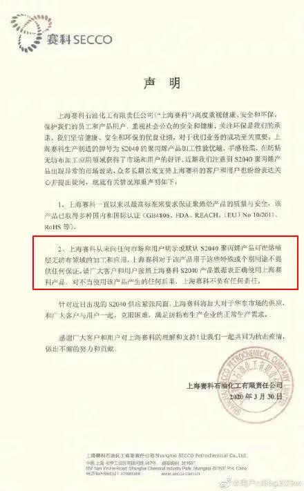 對于S2040聚丙稀能否應用到熔噴布生產(chǎn),上海賽科也出了一份聲明,聲明上寫到:上海賽科從未向任何市場和用戶明示或默認S2040聚丙稀產(chǎn)品可以用于無紡布領域的加工和應用。上海賽科對于該產(chǎn)品用于這些特殊或個別用途不提供任何保證。
